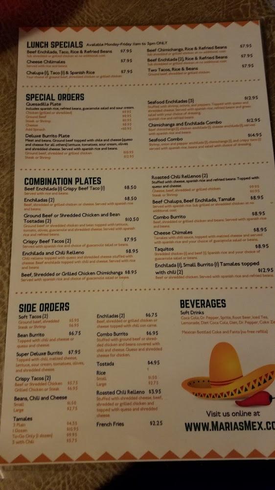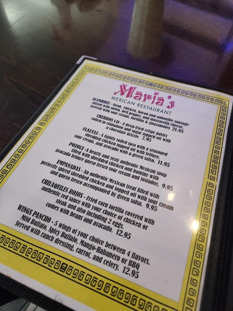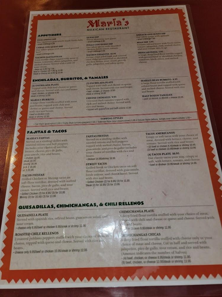 Maria's menu is extensive, featuring a diverse range of dishes that please every palate. Taco lovers can enjoy options from Al Pastor to Birria. For meat lovers, the fajitas and burritos bring vibrant flavors to the table. Vegetarians can delight in the selection of quesadillas and many sides. Desserts like Choco-Flan and apple pie round out a satisfying meal. The menu also offers kid-friendly choices, ensuring every family member enjoys their visit.